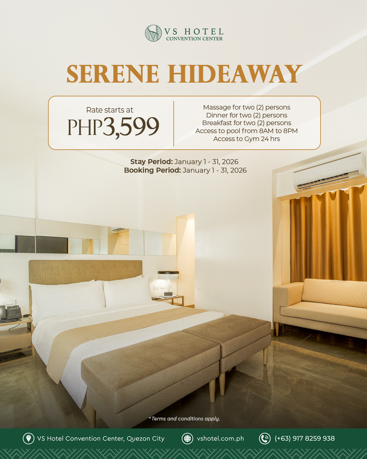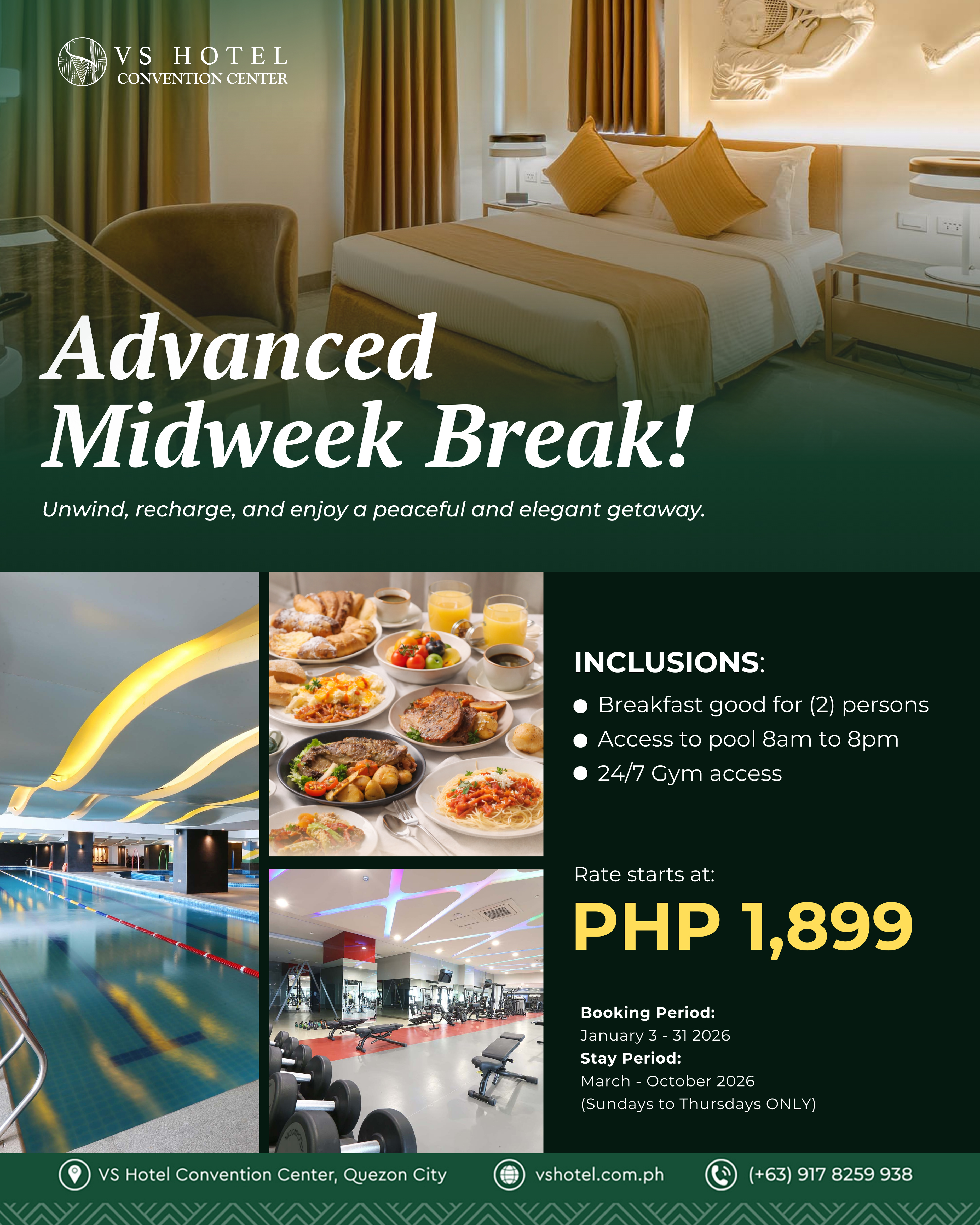 For inquiries and reservations, contact us at +632 8370-2892 or +63 917 8259 938. You may also email reservations@vshotel.com.ph or visit www.vshotel.com.ph.