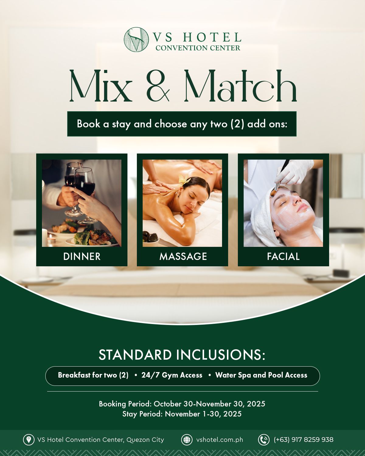 Turn your stay into an experience. VS Hotel Convention Center lets you personalize your stay with any two (2) add-ons of your choice: